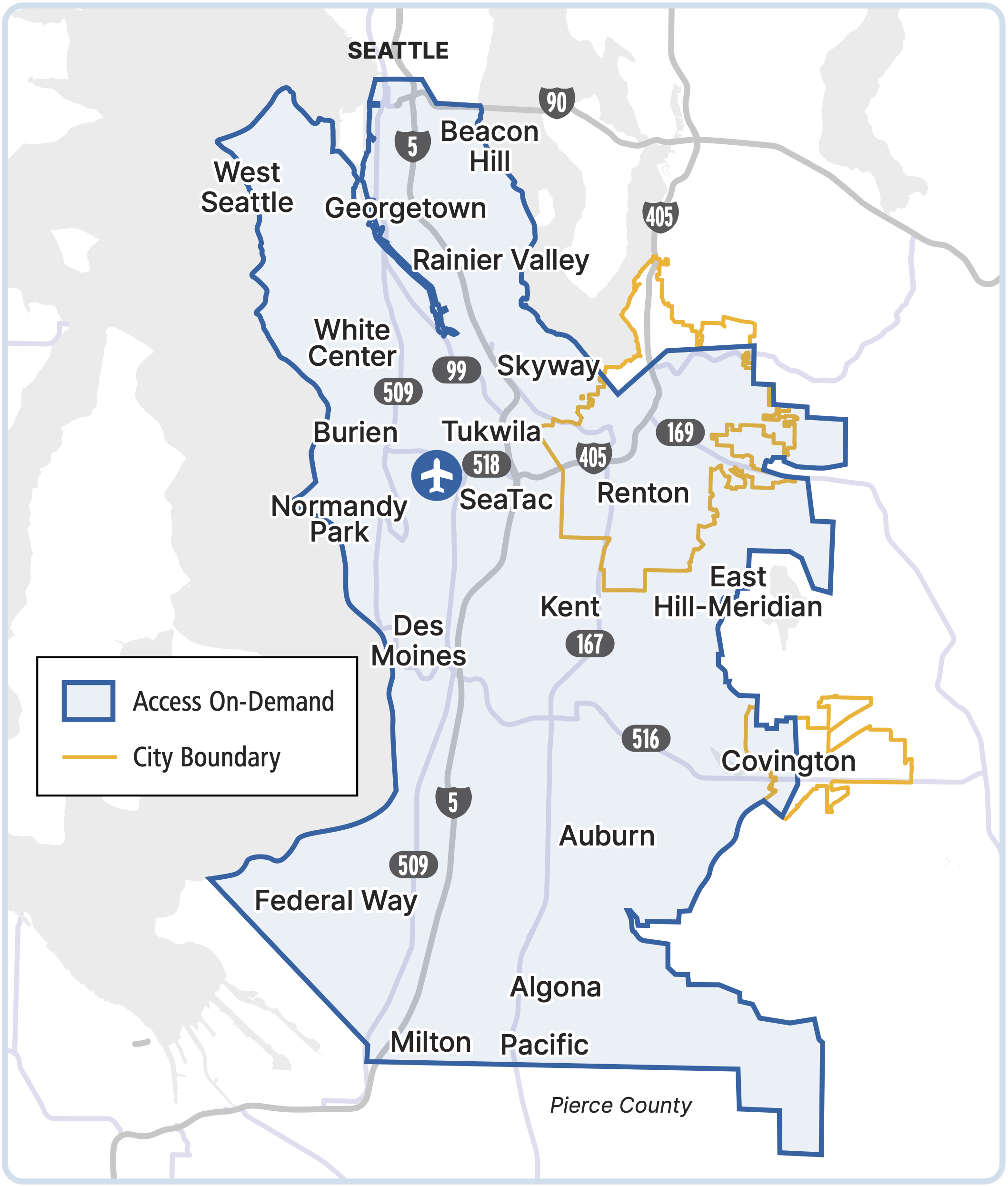 Map showing the Access On-Demand service area. Cities fully covered by the service area include Skyway, Burien, Tukwila, Normandy Park, Des Moines, Kent, East Hill-Meridian, Auburn, Algona, Federal Way, and Seatac. The Seattle-Tacoma International Airport is not within the service area. Seattle neighborhoods fully covered by the service area include Beacon Hill, West Seattle, Georgetown, Rainier Valley, and White Center. Cities partially covered by the service area include Milton and Pacific, where the portion of the city that is south of the King and Pierce County line is outside the service area; Renton, where a northern portion of the city is outside the service area; and Covington, where a central and eastern portion of the city is outside the service area. For more information, call 206-258-7739.